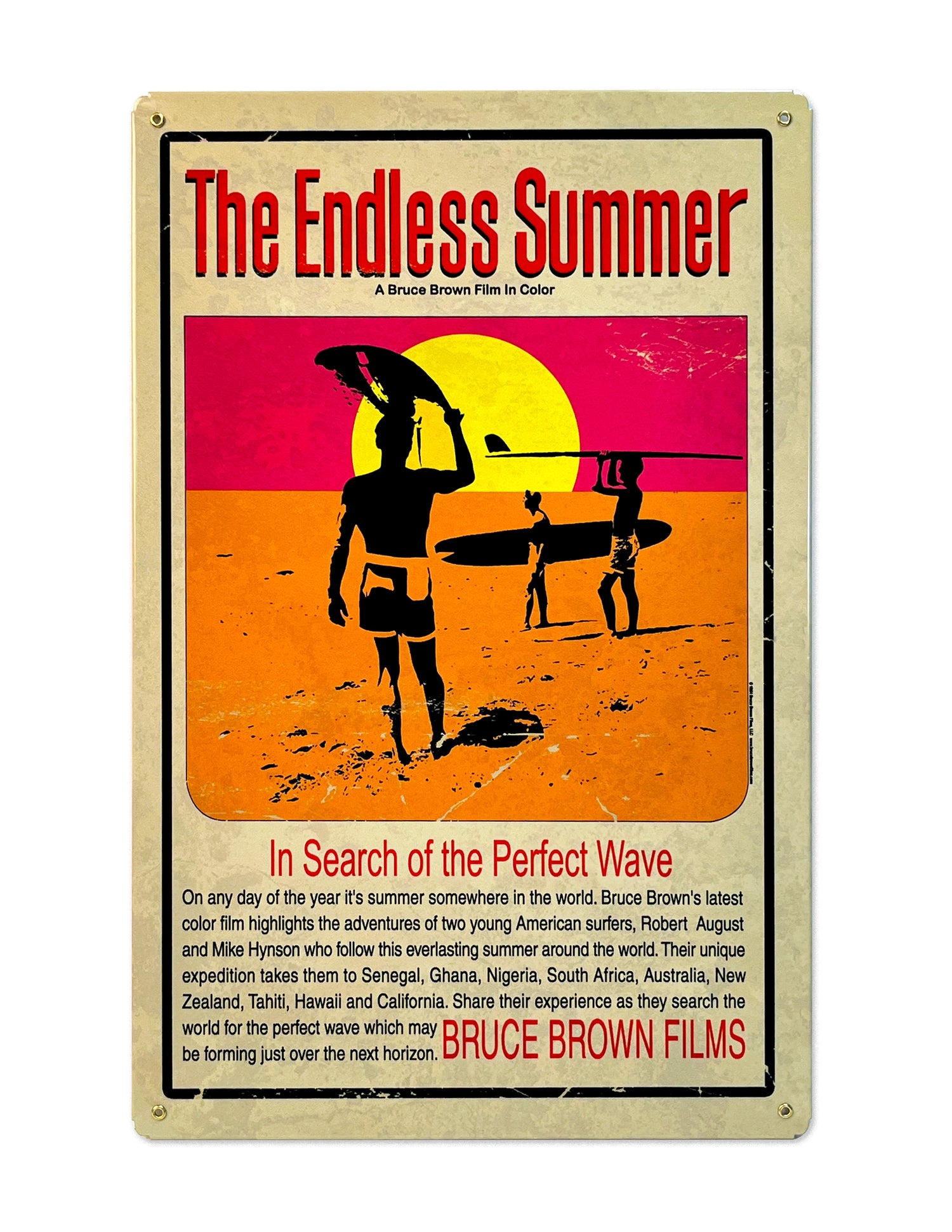 Academy Award-nominated director, Bruce Brown spent two years chasing summer around the world and capturing footage that set the standard for all future surf films. Surfers Michael Hynson and Robert August were lucky enough to get to search for the perfect wave off the coasts of Africa, Australia, New Zealand, Tahiti, and Hawai'i. Screened to audiences in Southern California in 1964, and distributed worldwide in 1966, The Endless Summer would go onto generate over $30 million dollars at the box office and take its rightful place as the king of surf videos.
